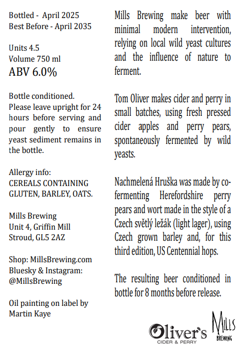 Nachmelená Hruška was made by co-fermenting Herefordshire perry pears (2024 harvest) and wort made in the style of a Czech světlý ležák (light lager), using Czech grown barley and, for this third edition, US Centennial hops. The resulting beer conditioned in bottle for 8 months before release.