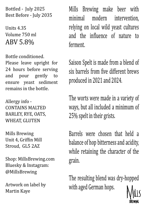 Saison Spelt is made from a blend of six barrels from five different brews produced in 2021 and 2024. We have been including spelt in many of our brews due to its wonderful brewing and drinking characteristics. As an ancient wheat cultivar, it brings the light bready character and foam enhancing properties of wheat, but also adds great character to the aroma and finish of the resulting beers.